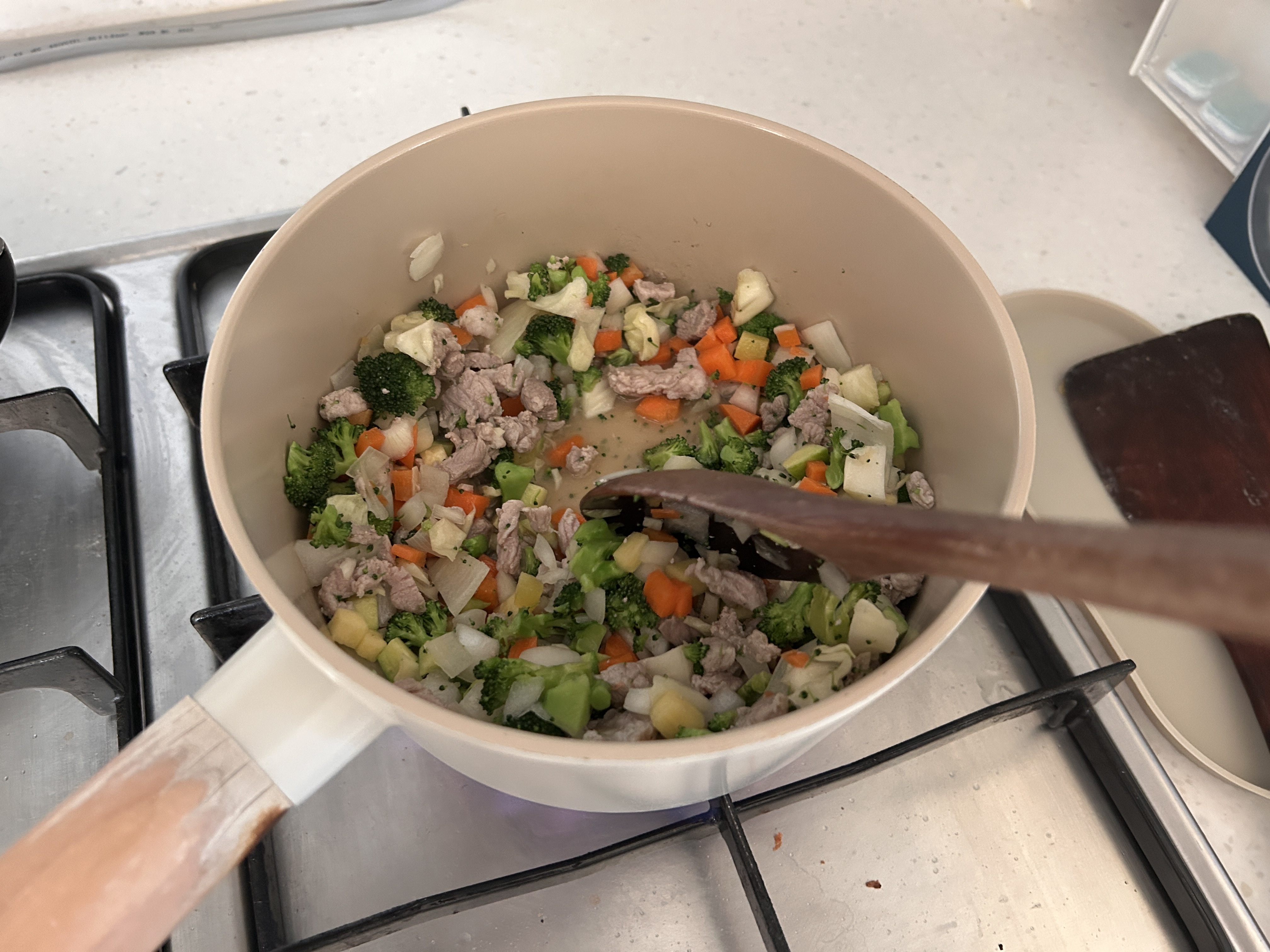 ✅ 양파, 감자, 당근, 애호박을 넣고 중약불에서 부드러워질 때까지 볶아요.