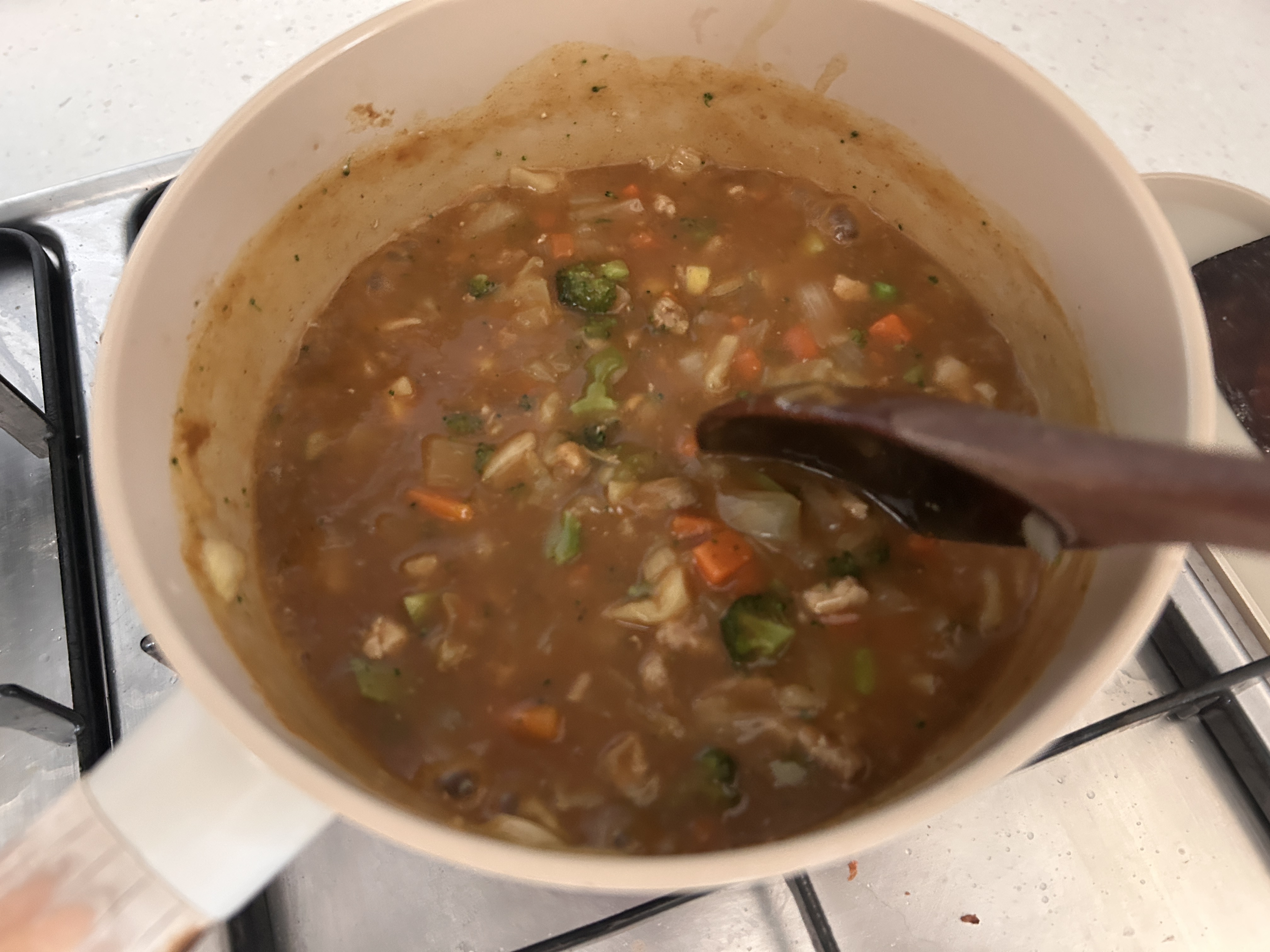 ✅ 불을 약하게 줄이고, 유아용 순한맛 카레 가루 2큰술을 넣어 잘 풀어줍니다.